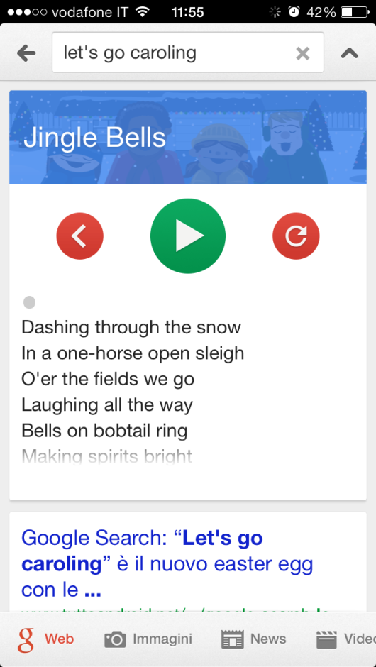 Basterà chiedere (o digitare) “let’s go caroling” (che significa “Cantiamo delle canzoni di Natale”) per accedere alla particolare funzionalità poc’anzi citata. Google Now è disponibile per dispositivi Android ma è accessibile anche su iPhone ed iPad attraverso l’app ufficiale di Google: