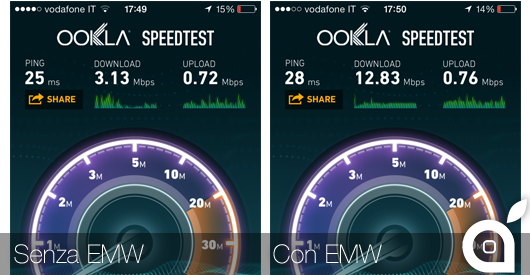 Infatti in questo caso il vantaggio che ho percepito non è tanto nell’aumento delle velocità di download ed upload, quanto nella stabilità del segnale e ciò potete notarlo anche nello speedtest osservando il grafico verde che a volte tocca lo zero nel caso “senza EMW”.