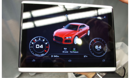 Le informazioni principali del veicolo possono essere trasmesse anche dal tablet. Nelle immagini è possibile vedere un display provvisto di contagiri, tachimetro, la quantità di carburante disponibile, i livelli dell’olio e la pressione degli pneumatici.
