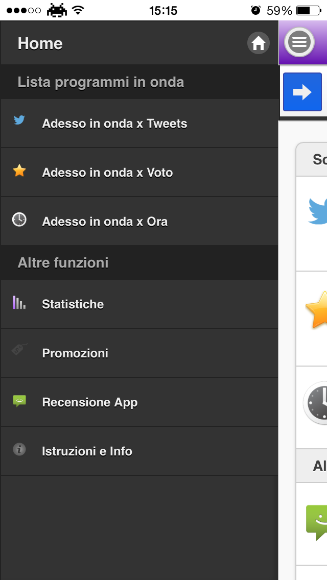 Come potete vedere nelle immagini, la schermata principale ed il menu sono divisi per sezioni. Il menu, che si può consultare premendo il tasto posto nell’angolo in alto a sinistra, può essere richiamato in qualsiasi schermata ci si trovi. Le varie sezioni sono le stesse quindi andiamole a scoprire. Nella sezione relativa ai programmi in onda abbiamo tre sottocategorie, “Tweets“, “Voto“, “Ora“. Vediamo come funzionano: