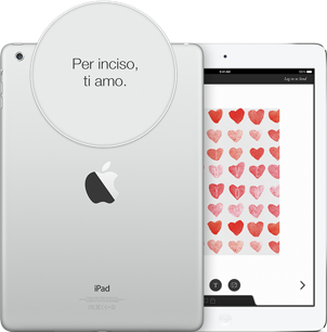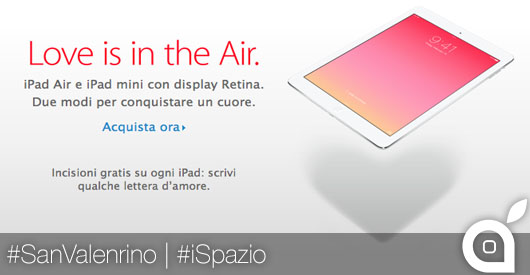 Apple ha aggiornato il proprio negozio virtuale aggiungendo le offerte ed i prodotti per San Valentino. L’iPad Air primeggia su tutti, con lo slogan “Love is in the Air“.