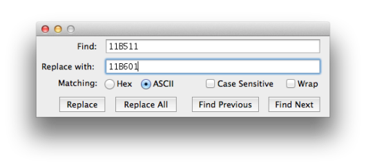 3. Cliccate contemporaneamente CMD+F sulla vostra tastiera per aprire il menu “Find”. Nella sezione “Trova” inserite 11B511 e nella sezione “Sostituisci” inserite 11B601, come mostrato nell’immagine qui sotto e poi cliccate su Replace All. Assicuratevi che il metodo di sostituzione sia ASCII e non Hex. Salvate ed uscite dal programma.