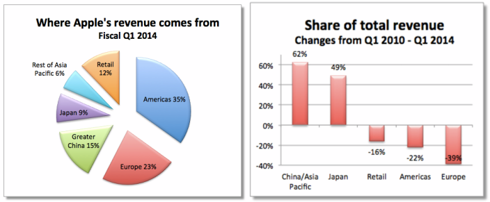Due grafici mostrano chiaramente da dove arrivano tutti i ricavi dell’azienda di Cupertino. Fortune mostra chiaramente come i guadagni per Apple arrivino perlopiù dall’America e dall’Europa. Ma la sorpresa è l’incredibile influenza della Cina.
