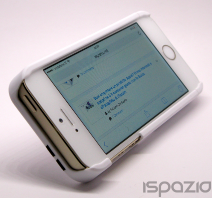 La custodia è anche dotata di un piccolo stand che permette di tenere l’iPhone appoggiato su una superficie in landscape a circa 45°.