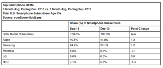 Dei 156 milioni di smartphone negli Stati Uniti, il 41,8% ha scelto di acquistare un iPhone mentre gli utenti con un cellulare Samsung rappresentano solamente il 26,1%. Le altre grandi aziende di telefonia, come Motorola, HTC ed LG, si posizionano molto lontano dalle quote suddette rispettivamente con il 6,7%, 5,7% e 6,6%.