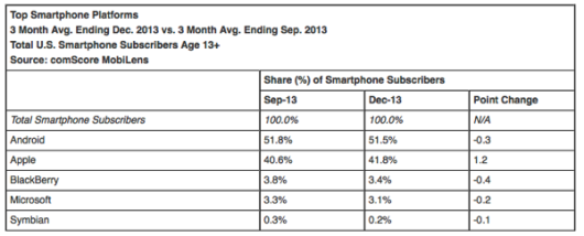 Apple ha confermato, nel Q4 del 2013, la sua leadership nel mercato americano degli smartphone. La sua quota, infatti, ha toccato quasi il 42% mentre ha dovuto cedere il passo ad Android nella categoria dei sistemi operativi. Il portale comScore, dopo aver analizzato i dati dell’ultimo trimestre dell’anno appena trascorso, ha riscontrato che sia Samsung che Apple hanno avuto una crescita del 1,2% rispetto ai tre mesi precedenti.
