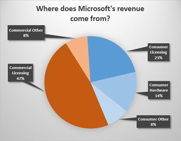 Microsoft sta conducendo la sua strategia verso la produzione di un proprio hardware, non solo con la sua linea di console di gioco Xbox, ma anche con il tablet Surface e gli smartphone che saranno lanciati non appena terminerà l’acquisto di Nokia. Nel complesso, però, la società dipende molto dalle licenze software per le imprese, ovvero il software Windows utilizzato sui PC aziendali.