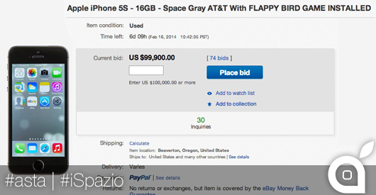 Al momento in cui stiamo scrivendo questo articolo, un iPhone 5S nero da 16 GB (la cui unica particolarità è avere Flappy Birds installato) ha raggiunto il prezzo di 99.900 dollari a seguito di oltre 70 offerte.