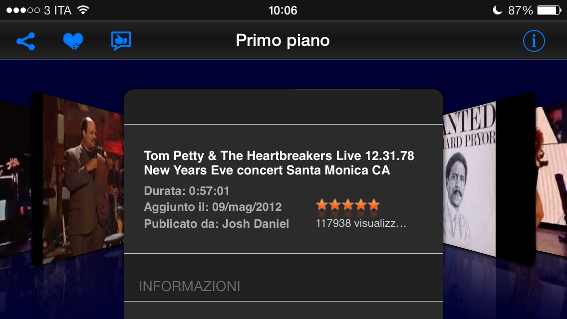 Potrete sfruttare gli stessi tasti presenti nella visualizzazione “classica” dei video, modificabile nella sezione Altro. Potrete, quindi, condividere il video su Facebook, Twitter o per Email tramite il tasto in alto a sinistra a forma di triangolo, aggiungerlo ai preferiti cliccando sul cuore, votarlo cliccando sulla mano con il pollice alzato oppure visualizzare le informazioni cliccando sulla “i” in alto a destra.