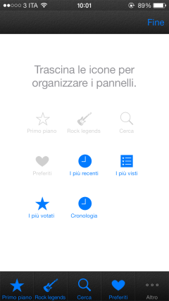 Non dimentichiamo il tasto Modifica in alto a destra. A differenza di quello che si possa pensare, selezionandolo potrete scegliere le sezioni da visualizzare nel menù in basso. Comparirà, infatti, la schermata relativa a tutte le icone: quelle in blu su sfondo bianco potete trascinarle verso il basso al posto di quelle presenti nel menù che, a loro volta, possono essere spostate o rimosse.