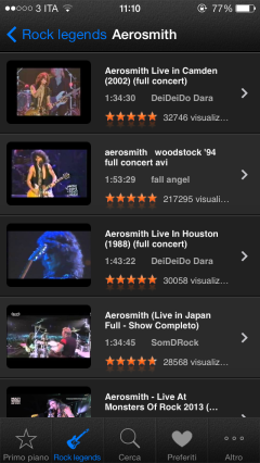 La sezione successiva, selezionabile attraverso il menù in basso, è Rock Legends. Questa vi permetterà di consultare tutti gli artisti presenti, scegliere quello che più vi piace e visualizzare tutti i concerti presenti su YouTube. La grafica è esattamente la stessa di quella vista nella sezione precedente, l’unica differenza è solo aver selezionato un unico artista.