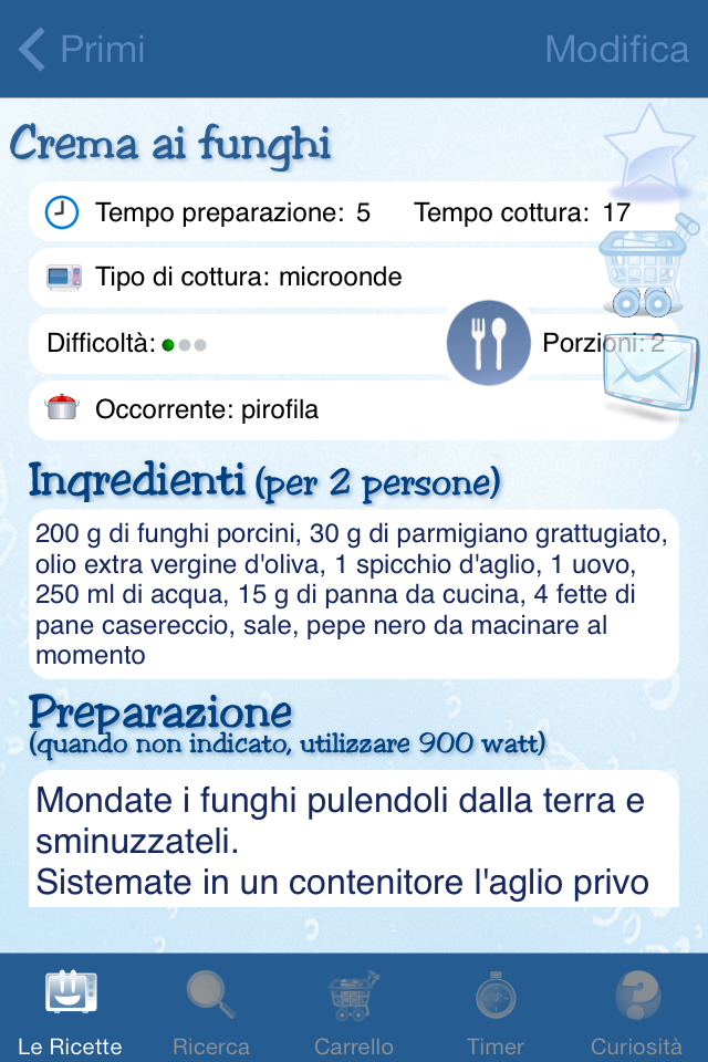 Quando avrete scelto la vostra ricetta ideale, cliccateci sopra, e compariranno tutti i dettagli per preparare il magnifico piatto che avete selezionato con tanto di ingredienti necessari e preparazione. Potrete inoltre scegliere se modificare a vostro piacimento la ricetta, aggiungerla ai Preferiti oppure al Carrello o inviarla via mail.