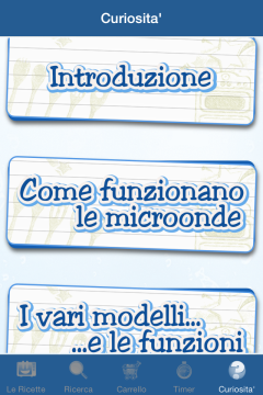 Ovviamente in un’app di cucina non poteva mancare la sezione dedicata alla ricerca delle ricette, per trovare in un batter d’occhio il vostro piatto preferito. Avrete anche a disposizione un utilissimo timer per tenere sempre sotto controllo il vostro piatto. Infine nella sezione Curiosità troverete diverse informazioni molto utili ed importanti per l’utilizzo del microonde e non solo.