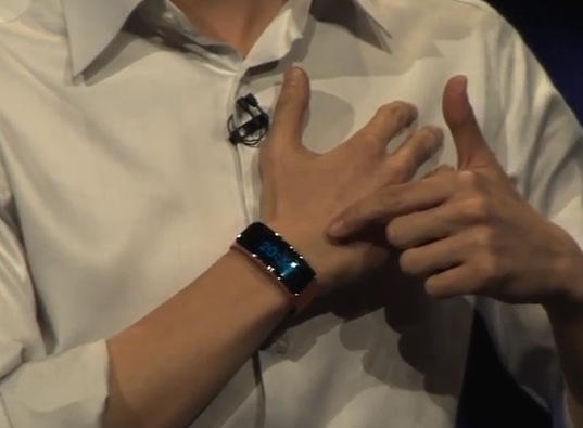 Il Gear Fit è un orologio/braccialetto che anzichè avere un display quadrato, ha una forma più allungata, ricorda in parte il TalkBand che Huawei ha presentato ieri (clicca qui per la notizia), ma non ha nulla a che vedere con questo.