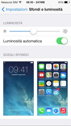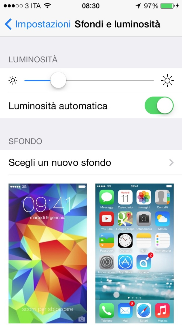 6. In Impostazioni > Sfondi e Luminosità, viene aggiunta l’etichetta “Scegli un nuovo sfondo” che permette di accedere alla sezione in cui scegliere gli sfondi. Inoltre, le due anteprime di sfondi sono ora cliccabili e potremo decidere se utilizzare lo “Zoom Prospettiva” o meno, semplicemente cliccandoci sopra. Finalmente riusciremo ad impostare gli sfondi delle dimensioni che vogliamo anche quando l’effetto parallasse è attivo.