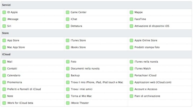 Il problema, come visibile dalla pagina ufficiale del sito Apple dedicata allo Stato del sistema, ha coinvolto i seguenti servizi: