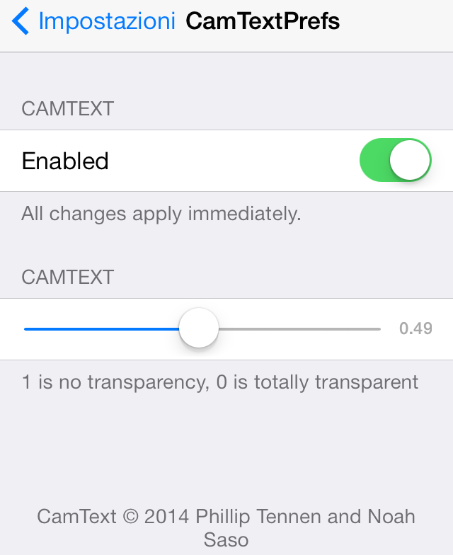 Come notate, viene reso tutto più o meno trasparente, mentre l’ideale sarebbe stato conservare il testo opaco ed al 100% visibile. E’ possibile regolare la trasparenza nelle impostazioni che troviamo dopo aver installato il tweak oltre ad attivare e disattivare CamText.
