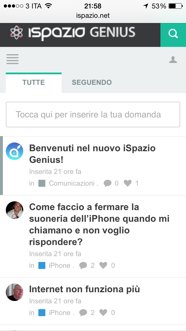 E’ un sito modernissimo, realizzato in stile flat, dalle forme essenziali ma non per questo scarno ed insignificante. Il suo scopo è quello di assistervi, permettendo a chiunque di inserire una domanda relativa ad un problema e di ottenere risposte valide e significative per risolverlo. L’idea di questo servizio nasce dal bisogno di evolversi, offrendo agli utenti un modo più semplice e moderno per interagire tra di loro e con lo Staff di questo sito per porre i propri quesiti. iSpazio è stato sempre molto attento alle novità proposte dal web e da anni crede fermamente nel progetto Genius come vera e propria evoluzione del concetto di Forum.