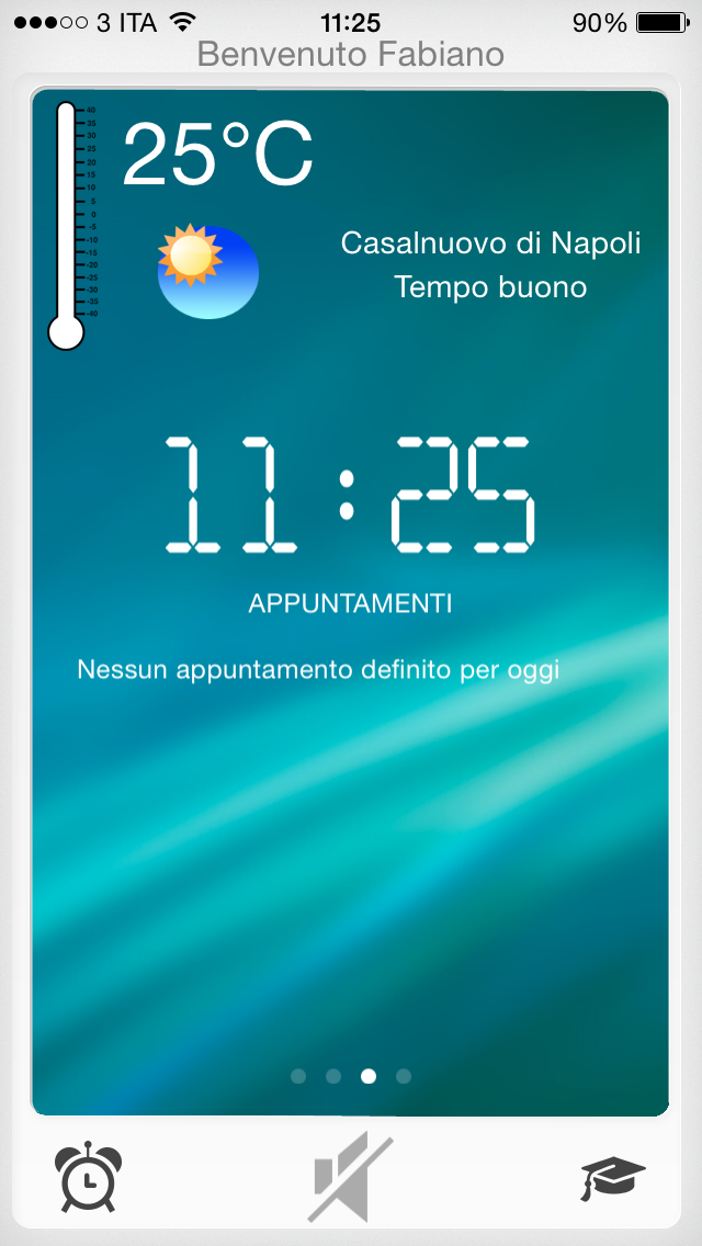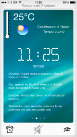 Nella schermata principale vengono mostrate l’ora e le condizioni meteo attuali della città in cui vi trovate (rilevata automaticamente). Il pannello inferiore dello schermo mostra diversi pulsanti: