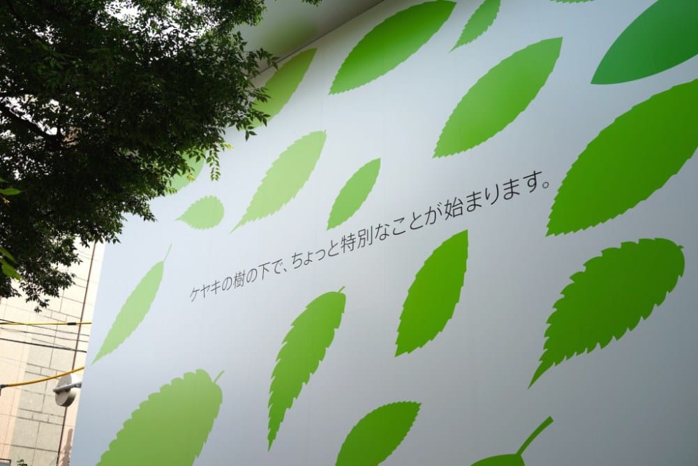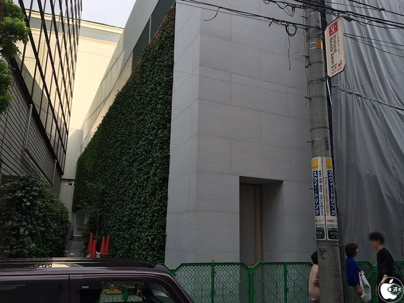 Ad annunciare la prossima apertura di Omotesando, infatti, vi sono una serie di cartelli di colore bianco e verde. La sezione verde, rappresentante delle foglie, nel corso delle sue spire disegna quello che è il classico logo di Cupertino.