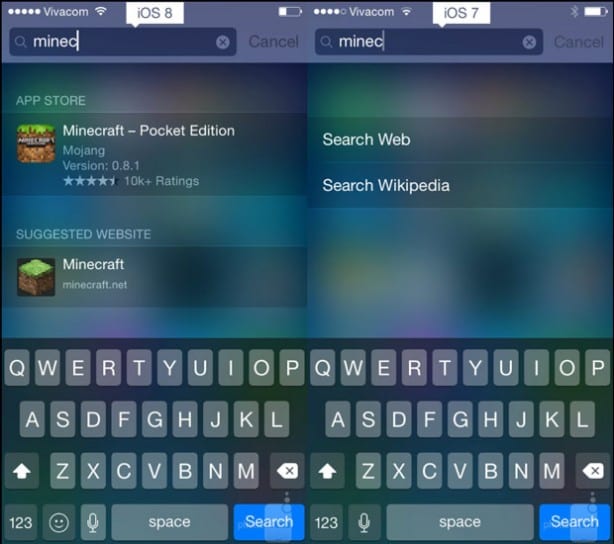 Le ricerche effettuate con spotlight risultano ancora più potenti. All’immissione di una chiave di ricerca corrisponde, con il nuovo sistema operativo, una lista di risultati più precisa che analizza i contenuti: sul dispositivo, in App Store, su Wikipedia e nel web.