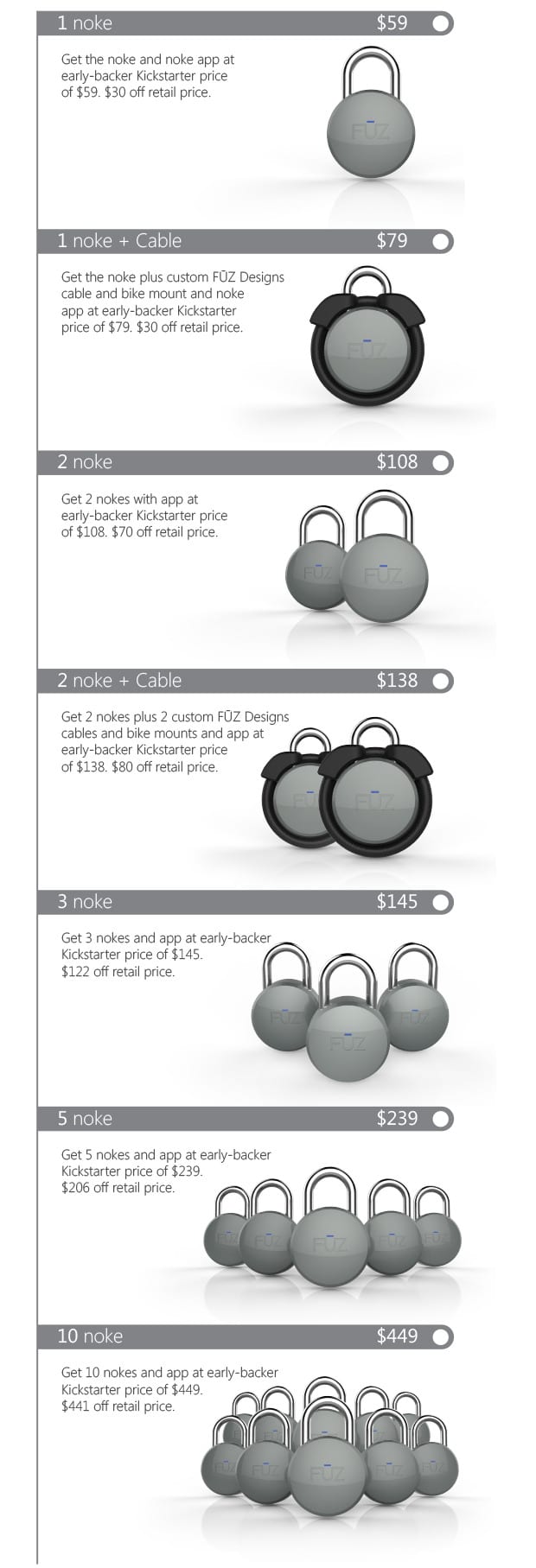 Come detto, Noke è un progetto Kickstarter ma ha recentemente superato la soglia minima per la sua commercializzazione e sarà presto disponibile nei negozi al prezzo di 89$. Avete ancora tempo nel caso vogliate supportare il progetto e pre ordinarlo al prezzo di 59$.