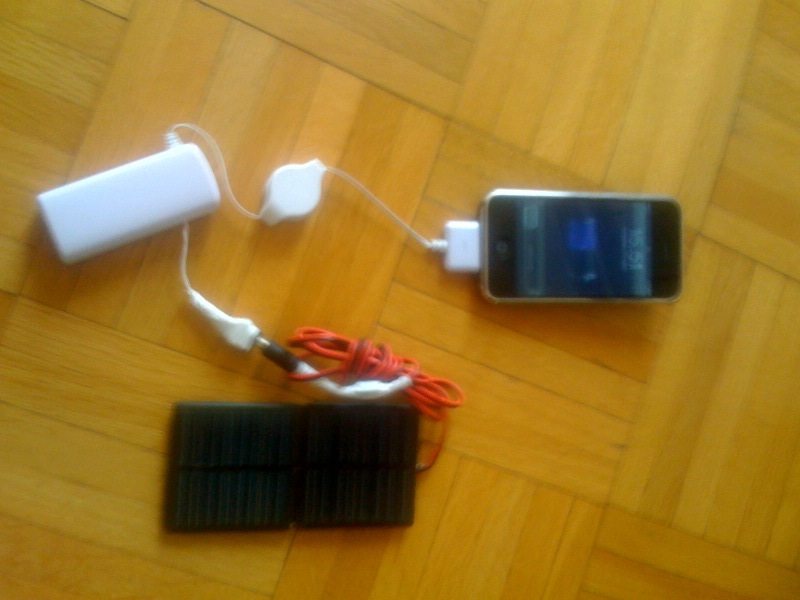 Sono stati utilizzati 2 pannelli solari, in particolare quelli dei lampioncini da giardino, successivamente saldati al caricabatterie di emergenze per iPhone, acquistato su internet (direttamente da Hong Kong) per 5€ con due pile ricaricabili da 1800 mAh