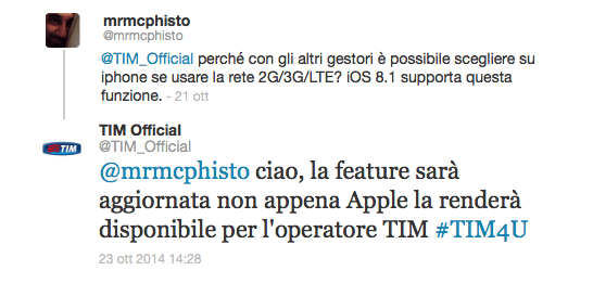 Con iOS 8.1 Apple ha implementato una nuova funzione che permette di mantenere attiva soltanto la rete 2G, disattivando le connessioni 3G e LTE per risparmiare batteria. Purtroppo al momento questa funzione non è disponibile con i nostri operatori ma di seguito vi riportiamo la risposta che ci ha fornito TIM a riguardo.