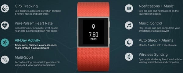 Il Fitbit Surge offre il tracking tramite GPS, il monitoraggio della frequenza cardiaca, e la registrazione di alcuni dati riguardanti l’attività fisica, come la distanza percorsa, le calore bruciate, contapassi e tanto altro ancora.