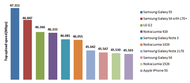 Per quanto riguarda la velocità di upload, invece, la classifica è molto diversa. Della top 3 mostrata nella classifica di download, solo Galaxy Note 3 resta all’interno della top 10 dei dispositivi più veloci in quanto ad upload guadagnandosi il 5° posto. Per quanto riguarda le posizioni alte, Samsung domina il podio con Galaxy S5 al primo posto con 47.311Mbps e Galaxy S4 al secondo posto con 46.847Mbps.