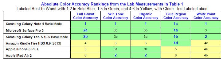 I prodotti Apple, pur piazzandosi dopo Smasung Galaxy Note 4, hanno ottenuto ottimi risultati nelle categorie Skin Tone e Organic Color Accuracy. Stessa cosa non può dirsi delle restanti categorie dove si posizionano dopo i prodotti Microsoft e Samsung.
