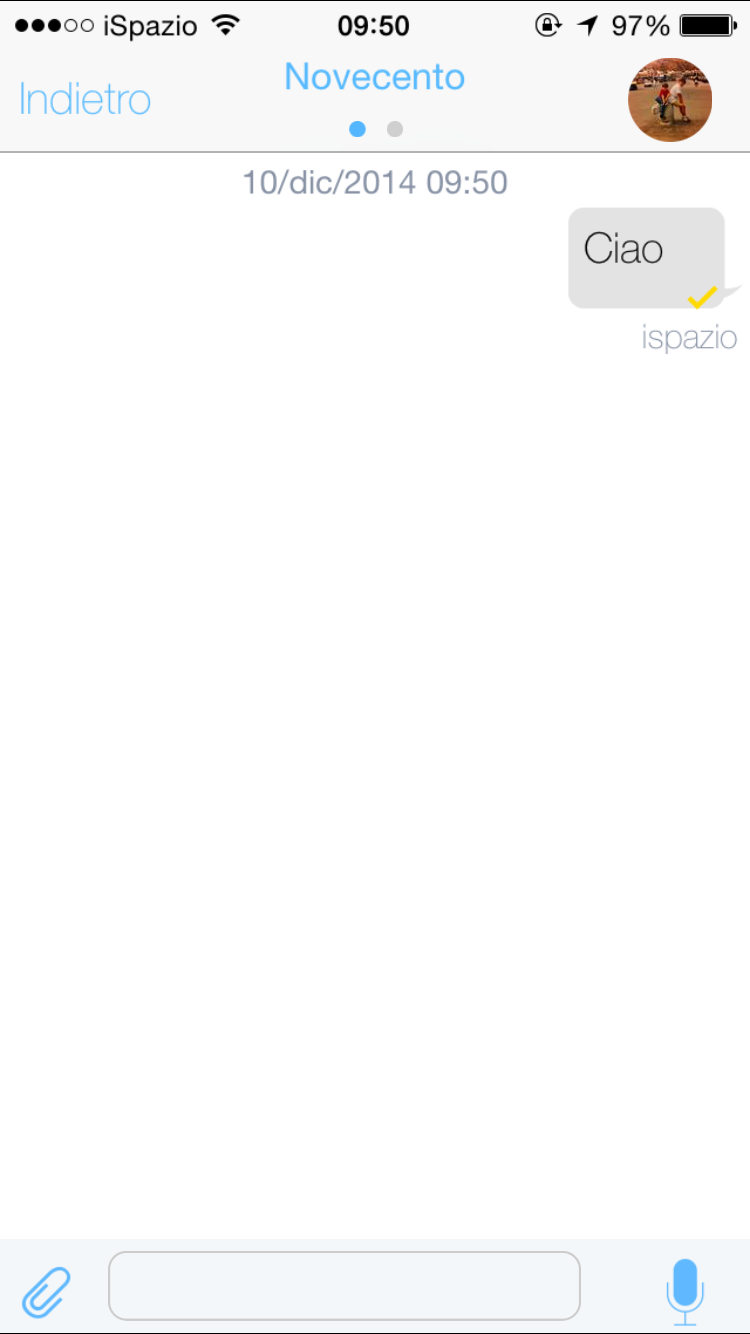 Cliccando su un nome avvieremo la Chat che avverrà attraverso una schermata molto pulita e minimale. Sulla destra troviamo l’icona che ci permette di registrare messaggi vocali con un sistema identico a quello di iMessage. Cliccando la graffetta sulla sinistra invece, potremo scattare una foto, creare un video, inviare un’immagine o un filmato dal rullino ed inviare la nostra posizione. Troviamo anche una spunta che risulterà gialla quando il messaggio viene inviato e verde quando viene effettivamente consegnato. Non troviamo alcuna doppia spunta in caso di lettura.