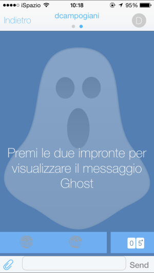 Per fare in modo che i messaggi risultino davvero privati, è stato escogitato un sistema che impedisce anche di effettuare screenshot con i tradizionali tasti di accensione e home dell’iPhone. Per visualizzare i messaggi ghost infatti, è necessario toccare lo schermo con due dita in punti specifici! Solo a questo punto la schermata blu con il fantasmino sparirà, mostrando i messaggi veri e propri che verranno poi auto-eliminati dopo alcuni secondi.