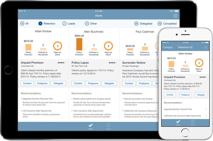 - Retention (assicurazioni) consente agli agenti di accedere ai profili e allo storico dei clienti, incluso il punteggio di ritenzione del rischio basato sugli analytics, di ricevere anche avvisi smart, promemoria e raccomandazioni sui migliori passi successivi da intraprendere, e la possibilità di condurre in modo più agevole le transazioni chiave, come la raccolta di firme elettroniche e la riscossione dei premi.