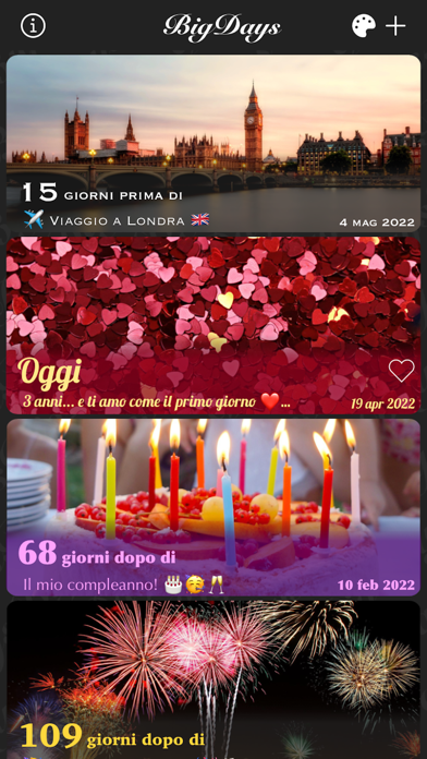Big Days è un’app elegante e leggera per ricordare e monitorare i tuoi eventi in modo semplice e veloce. Visualizza quanti giorni mancano o quanti giorni sono trascorsi dopo un evento. [screen]940109775[/screen]
