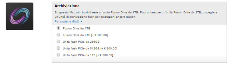 La nuova configurazione di cui parliamo riguarda Mac Mini nella versione da 2.8GHz. Come si evince dallo Store, la macchina può essere ora ordinata scegliendo per l’archiviazione Fusion Drive da 1TB, Fusion Drive da 2TB, unità flash PCIe da 256GB, 512GB o 1TB.