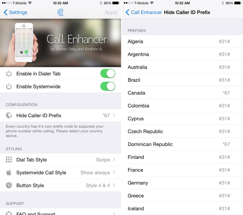 Nonostante sia di semplice utilizzo il tweak giunge con un vasto pannello di personalizzazione che include la possibilità di essere attivato direttamente dal dealer. Potrete scegliere inoltre il codice predefinito del vostro paese così da garantire la funzionalità del processo di occultamento del numero.