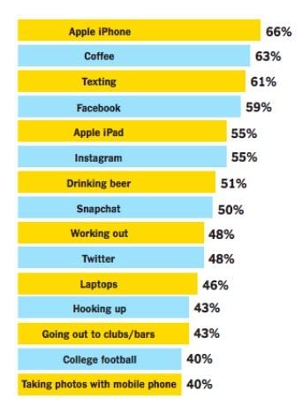 La ricerca è stata effettuata su un campione di 1,200 studenti a cui è stata rilasciata una lista a fini di sondaggio che comprendeva 77 beni e servizi. Nonostante la lista figuri nomi come la sempre amata birra, il football e le feste mondane, gli studenti si trovano d’accordo nel catalizzare i loro desideri su iPhone, facendo guadagnare allo smartphone di Cupertino il 66% delle scelte effettuate.