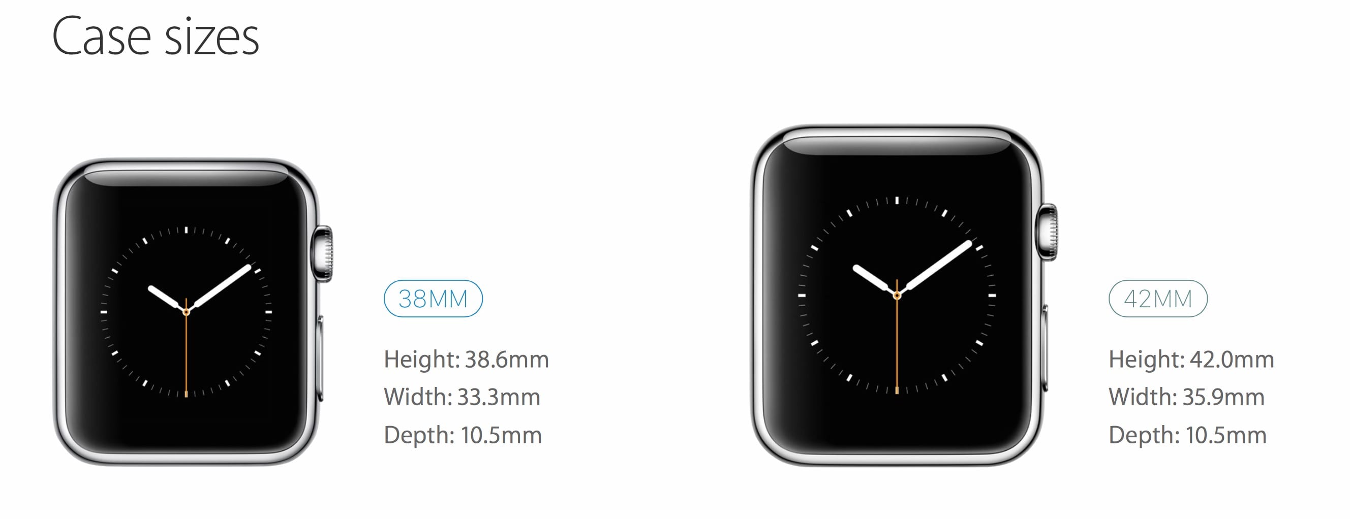 Partiamo innanzi tutto con le due casse. L’Apple Watch sarà disponibile in due diverse taglie, una da 38mm che generalmente è utilizzata dalle donne e le dimensioni per la precisione sono di 38.6mm in altezza, 33.3 in larghezza e 10,5mm di profondità. La cassa più grande è da 42mm ed in genere è quella utilizzata dagli uomini, anche in questo caso le misure esatte sono: 32mm in altezza, 45,9mm in larghezza e 10,5mm di profondità.