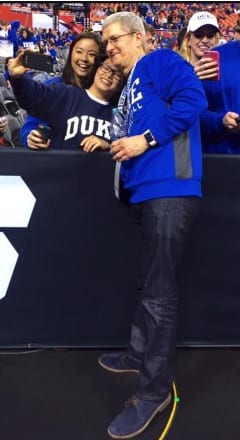Alla partita che ha visto la vittoria dei Duke 68 a 63, tra le fila dei tifosi spiccava il CEO di Apple Tim Cook con al polso il solito Apple Watch. Probabilmente il CEO, da sportivo e fan dei Blue Devils, non ha trovato occasione migliore di fare pubblicità al dispositivo che vedrà lo start delle prevendite tra qualche giorno.