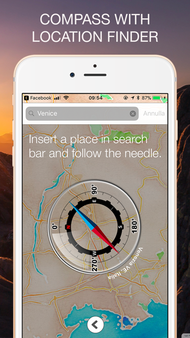 - Bussola: una bussola indica visivamente il Nord e vi scrive in che direzione state guardando. Usate la nuovissima funzione “place finder” per vedere in quale direzione si trova una città o un luogo a vostra scelta.