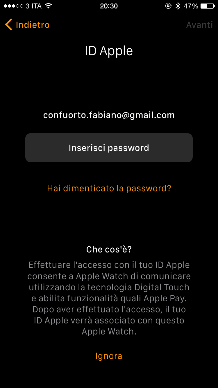 Il secondo Step permetterà di configurare il proprio Apple ID anche su Apple Watch. Il tutto avviene semplicemente inserendo la password del proprio account. Questo processo può essere ignorato ma non è consigliabile farlo perchè con l’accesso permetterete ad Apple Watch di comunicare con altre persone utilizzando il Digital Touch (una sorta di iMessage fatto di disegnini, valido soltanto tra persone che posseggono l’orologio) ed abiliterete l’Apple Pay (malgrado nel nostro Paese non funzioni ancora).