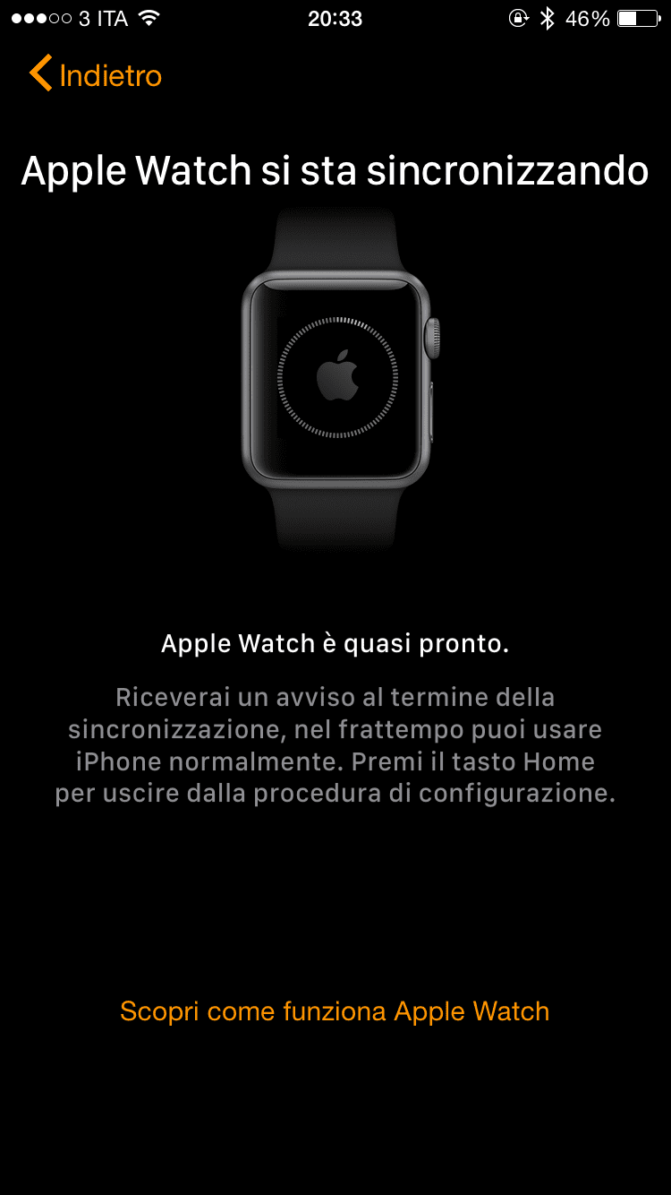Dopo aver configurato l’orologio attraverso il nostro telefono, partirà un processo di Sincornizzazione. Verranno trasferite tutte le informazioni che abbiamo impostato, e finalmente saremo pronti ad utilizzarlo. Questo processo dura un paio di minuti e sullo schermo dell’orologio potremo visualizzare i progressi d’avanzamento attraverso delle lineette che compongono un cerchio intorno al logo Apple. Anche lo stato di avanzamento si sincronizza in mirroring sullo schermo dell’iPhone.