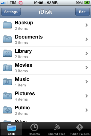 Con l’applicazione iDisk potrete accedere alle cartelle pubbliche degli altri iscritti a MobileMe, dovunque voi siate, e memorizzare quelle che utilizzate più spesso per reperirle in un secondo momento con estrema facilità. Dovete accedere a una cartella pubblica ma non ricordate il nome dell’iscritto a MobileMe? iDisk per iPhone effettuerà una ricerca tra i vostri contatti trovando chi possiede un indirizzo me.com.