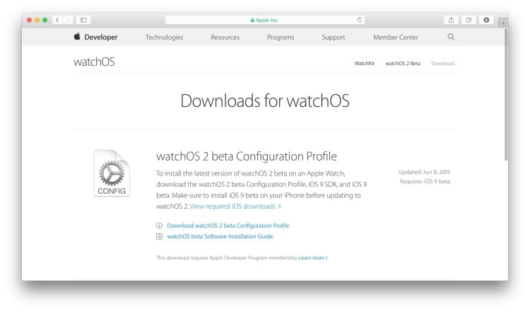 - Scaricate il watchOS 2 beta Configuration Profile dal sito per gli sviluppatori