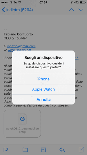 - Cliccate sull’allegato e visualizzerete un messaggio che vi permetterà di scegliere dove installare il file di configurazione tra iPhone ed Apple Watch. Scegliete Apple Watch.