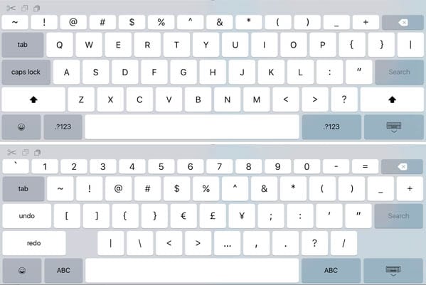 Con una risoluzione più elevata, la UIKeyboard si autoridimensiona, riposizionando i tasti per riempire il maggior spazio a disposizione. In particolare, la nuova tastiera presenta tasti più grandi, una nuova fila di simboli posta in alto, i tasti Caps Lock e Tab a sinistra e altri tasti riposizionati.