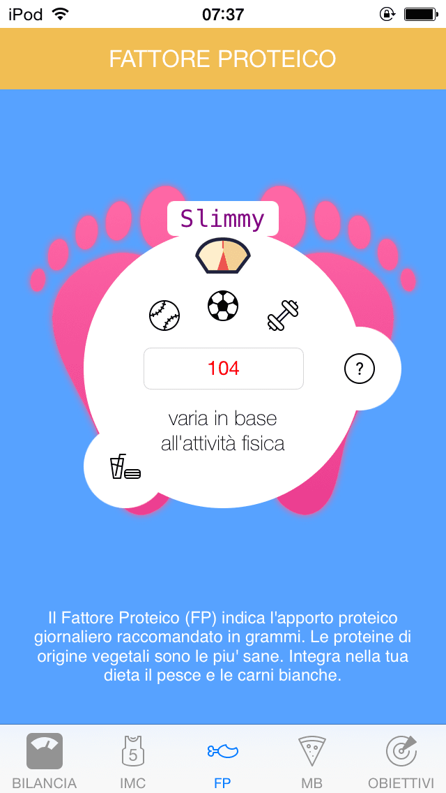 L’icona a forma di coscia di pollo è invece dedicata al fattore proteico FP. Qui viene indicata la quantità di proteine che bisognerebbe assumere, un valore che però cambia molto a seconda dell’attività fisica giornaliera svolta.
