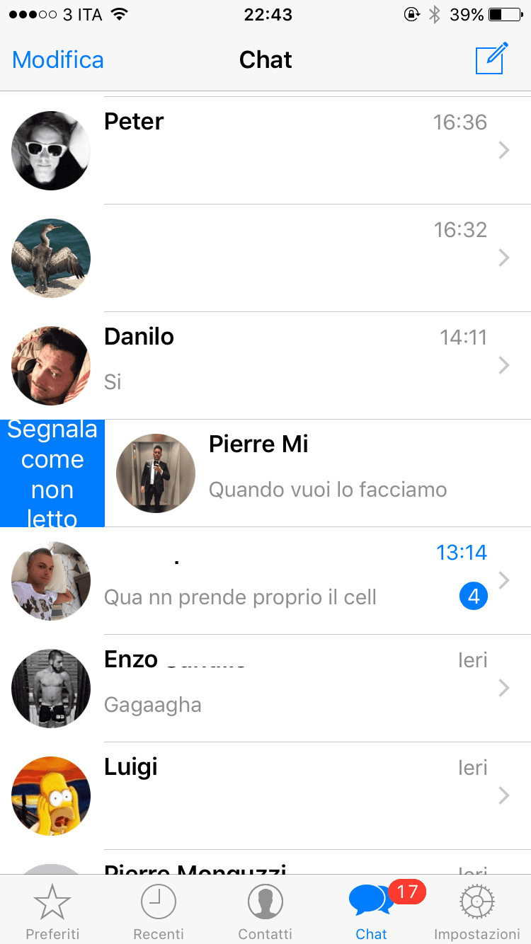 - Segnala come non letto o come letto trascinando la chat verso destra