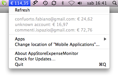 Il funzionamento è veramente semplicissimo. Basterà scaricare ed installare App Store Expense Monitor, ed automaticamente, dopo una breve sincronizzazione, vedrete apparire la cifra sulla StatusBar del vostro Mac.